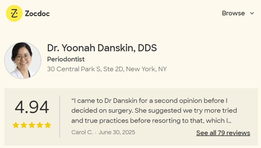 Dr. Yoonah Danskin is a board certified periodontist and a Diplomate of the American Board of Periodontology. She specializes in Periodontics (gums and bone structures that supports teeth) and Implant Surgery in Manhattan. She aims to create a stable foundation for a beautiful and healthy smile and believes in personalized treatment plans that are tailored to individual needs. Her team takes great pride in delivering quality care that is long lasting and precise.